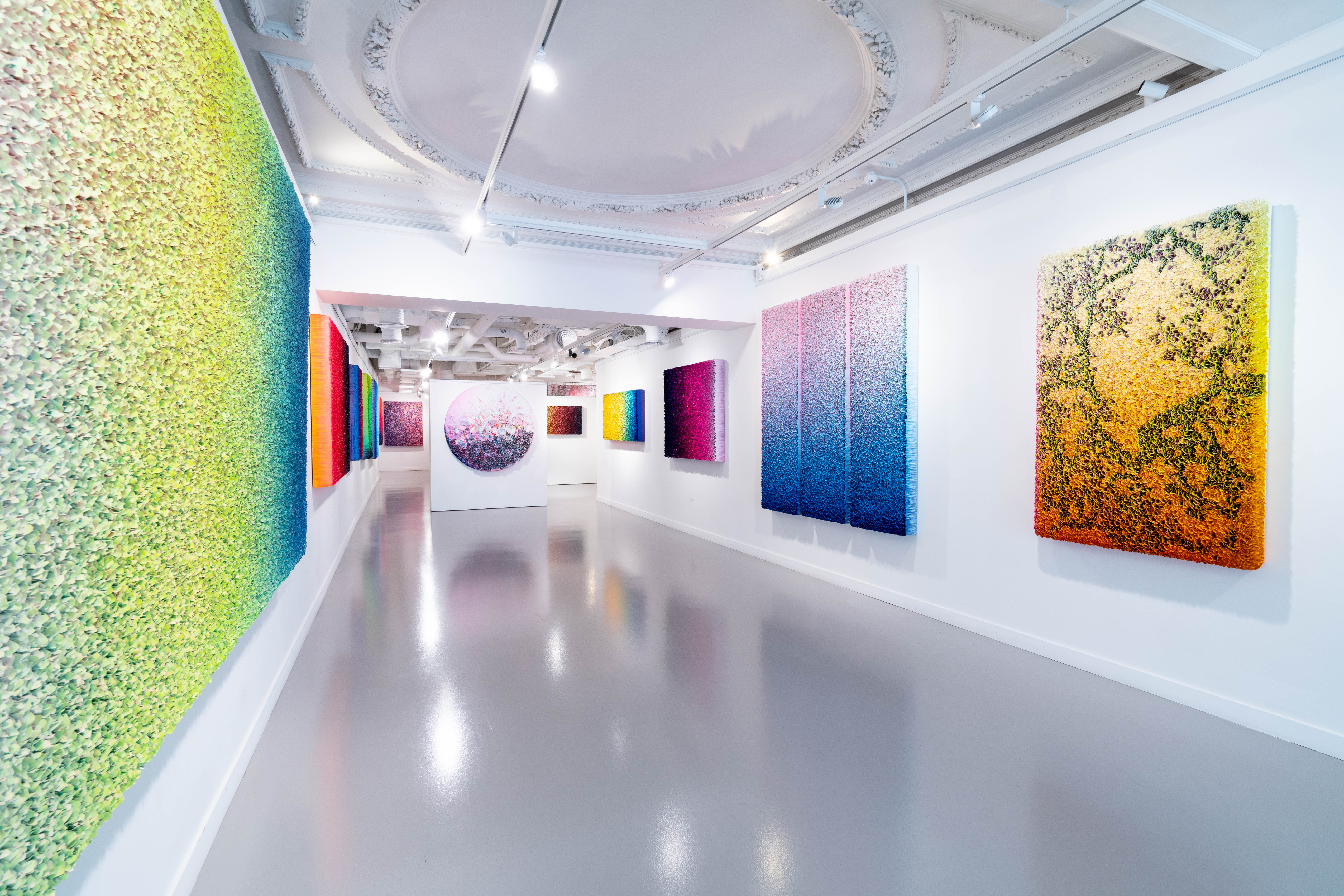 The simplicity of his chosen medium of delicate rice paper is strategically placed and achieves a highly decorative, elusively enhancing floral fabrication. Correlating colours that subtly shift in variation skilfully aid a sense of movement of not just the eyes but the body of the viewer as they move from side to side, making them an active participant of his compositions.